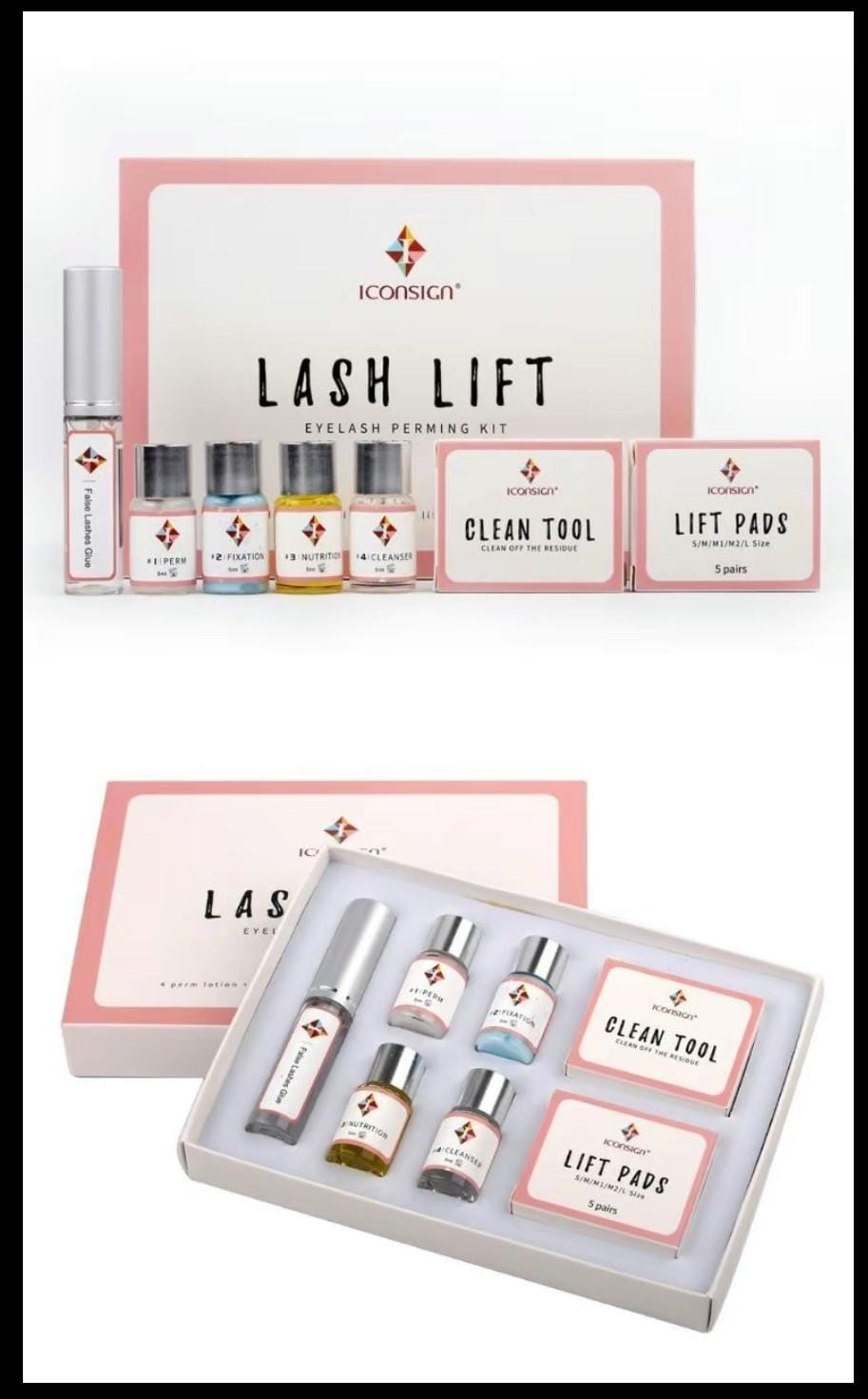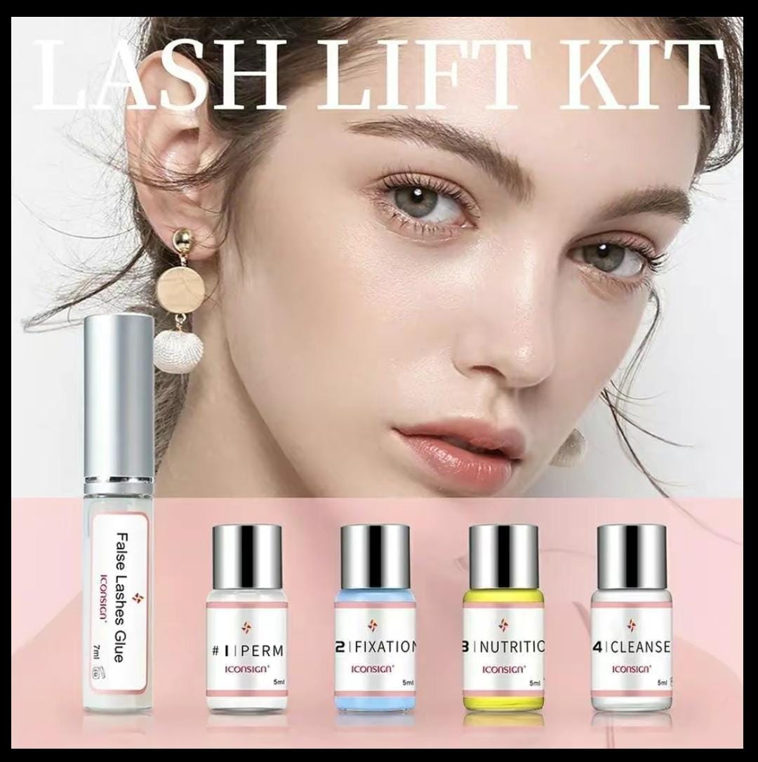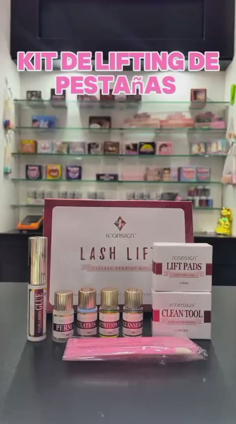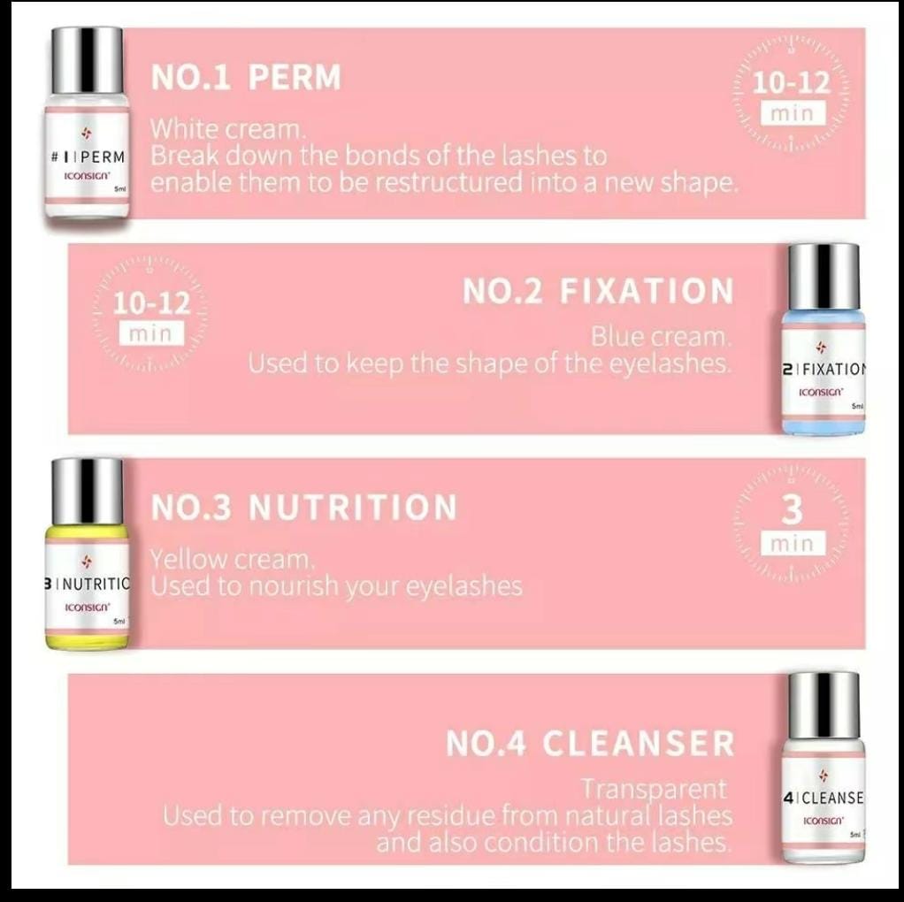 Contiene 8 productos, pegamento, liquido permanente, fijador, nutriente para pestañas, limpiador, almohadillas elevadoras, herramientas de limpieza, cepillos aplicadores, micro brush.